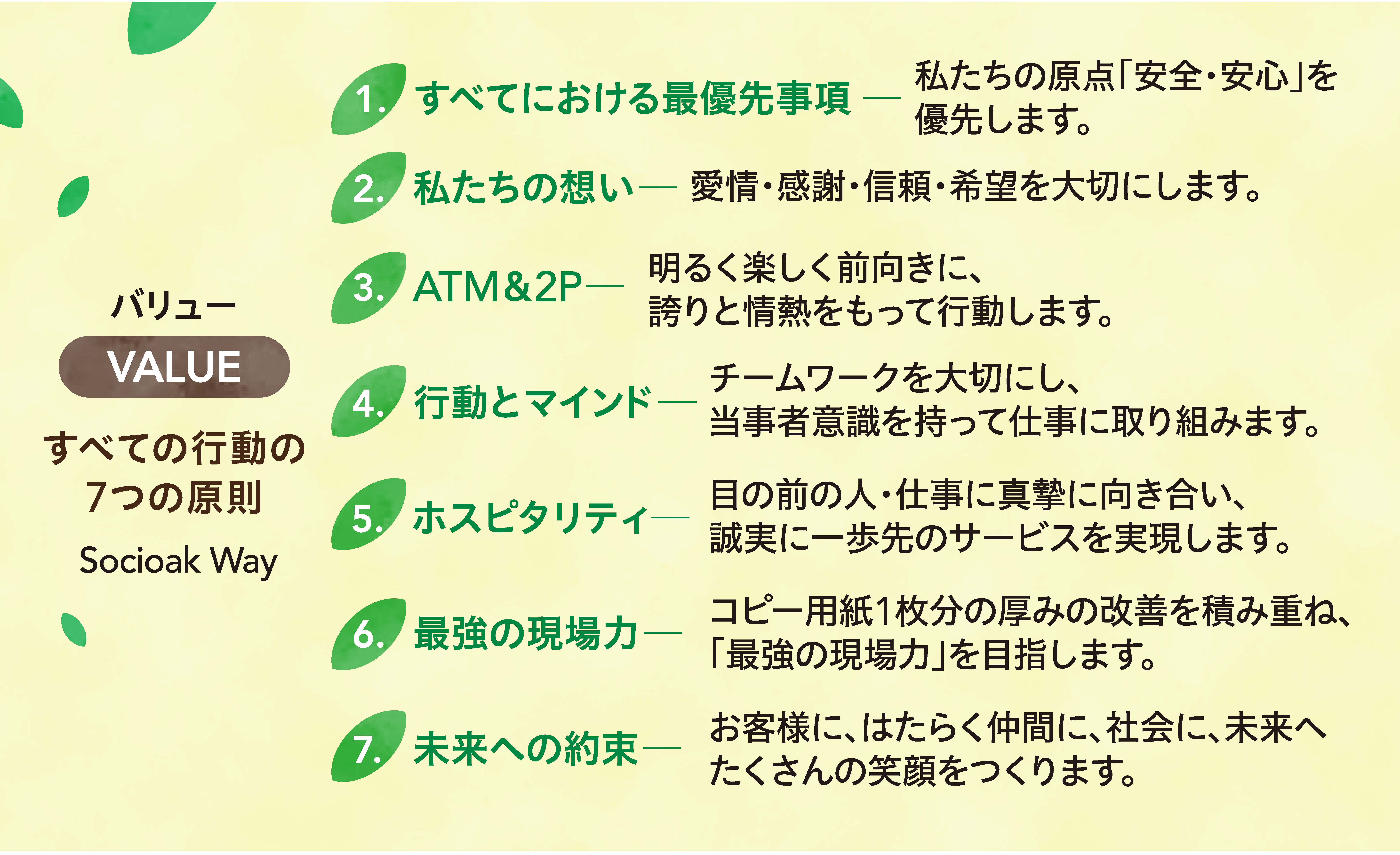 中でも、バリューとして掲げている「Socioak Way すべての行動の7つの原則」は、日々の業務やお客様との関わりの中で、私たちが大切にしている価値観を表しています。